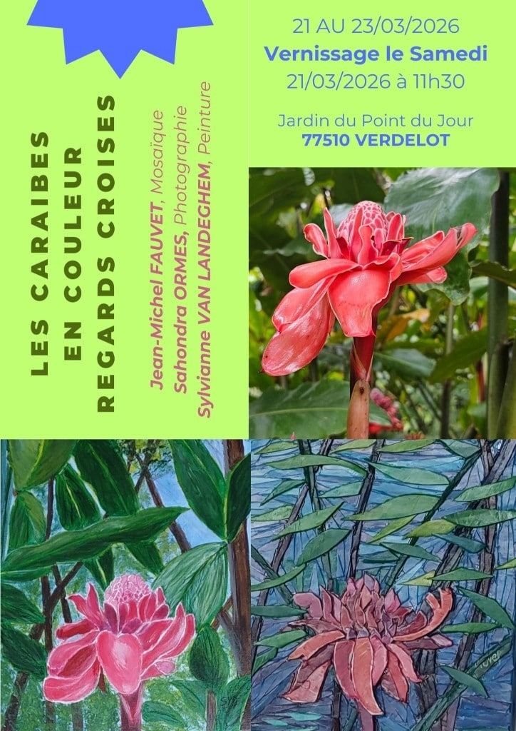 📌Les 21/22/23 mars 2026 Vernissage le Samedi 21 mars à 11h30 🌿☘️Nous avons le plaisir d'accueillir l' exposition LES CARAIBES EN COULEUR REGARDS CROISES 🌴🐚 Vous découvrirez les oeuves de Jean Michel Fauvet (Mosaïque) Sahondra Ormes ( Photographie) Sylvianne Van Landeghem ( peinture ) 📍Jardin le Point du Jour 77510…
